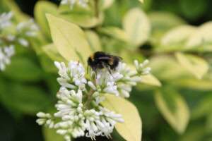 We have a large hibiscus hedge bordering one side of our garden which is in full bloom at the moment. The black berry (bramble — depending where you grew up) bush is nearing the end of it’s flowering stage, with the fruits starting to form. Both these are a huge magnet to bees and hover