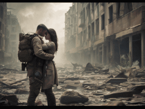 Hi All 👋 My latest post for Susan’s Digital Art Challenge: A Dangerous Liaison in a Warzone. I had a clear direction for this challenge: a kiss in a wartorn city. I used a baseline picture of a street in Glasgow for this. I’ve got three favourites from this mammoth session on ChatGPT.